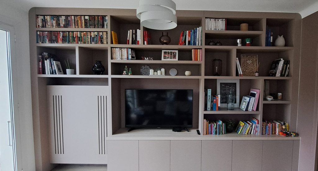 Bibliothèque sur mesure avec niche TV et cache-radiateur
